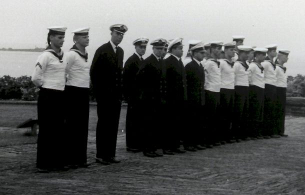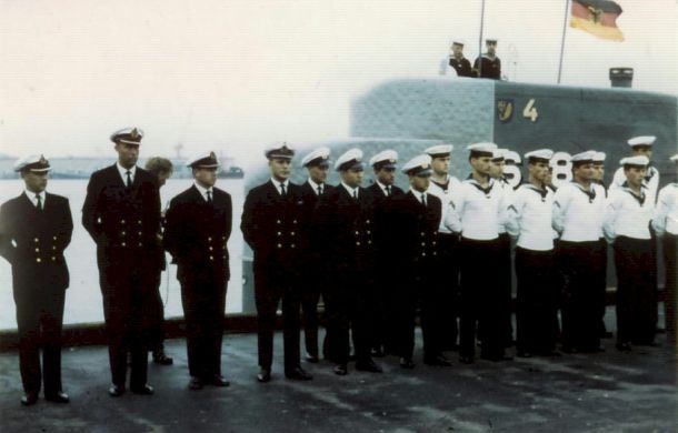 Foto: 1. Klaus Kiesel, seemännischer Gast - 2. Heinrich Dühring, Sonarmaat - 3. Jürgen Kössler, Kommandant - 4. Roland Schiemann, Sonargast - 5. Ludwig Bock, Obermaschinist - 6. Rudorlf Cords, Zentralegast - 7. Dieter Haase, Leitender Ingenieur - 8. Frank Gattermann, Funker - 9. Hans Ney, E-Maat - 10. Ernst Müller, Zentralemaat - 11. Horst Gerhards, Sonarmeister - 12. Friedhelm Holey, Smutje - 13.Dieter Koziol, Maschinen-Maat