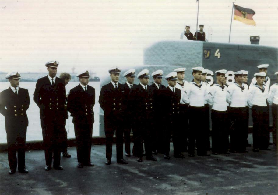 Foto: 1. Klaus Kiesel, seemännischer Gast - 2. Heinrich Dühring, Sonarmaat - 3. Jürgen Kössler, Kommandant - 4. Roland Schiemann, Sonargast - 5. Ludwig Bock, Obermaschinist - 6. Rudorlf Cords, Zentralegast - 7. Dieter Haase, Leitender Ingenieur - 8. Frank Gattermann, Funker - 9. Hans Ney, E-Maat - 10. Ernst Müller, Zentralemaat - 11. Horst Gerhards, Sonarmeister - 12. Friedhelm Holey, Smutje - 13.Dieter Koziol, Maschinen-Maat